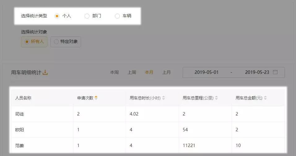 企业用车新增用车统计,可根据人员、车辆等维度,统计用车时长及费用,实现更精细的用车费用管理。