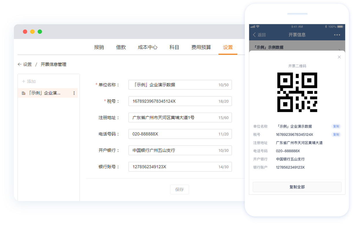 开票信息设置:财务人员可在后台统一管理和维护企业发票抬头及税号。开票时,员工即可通过手机端一键复制开票信息,或通过出示二维码快速开票。统一的开票信息管理,可以从源头上有效减少错误票据的产生,免填写的极速开票体验也轻松提高了员工的满意度。