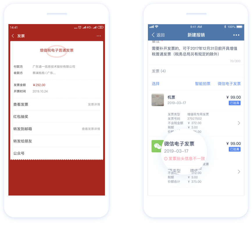 一键导入发票:杏盛娱乐注册费控报销打通微信卡包,员工报销时可直接从微信卡包中导入电子发票,系统会自动校验发票抬头和税号,并将发票信息同步填写进报销明细中,让员工报销电子发票更合规和快捷。