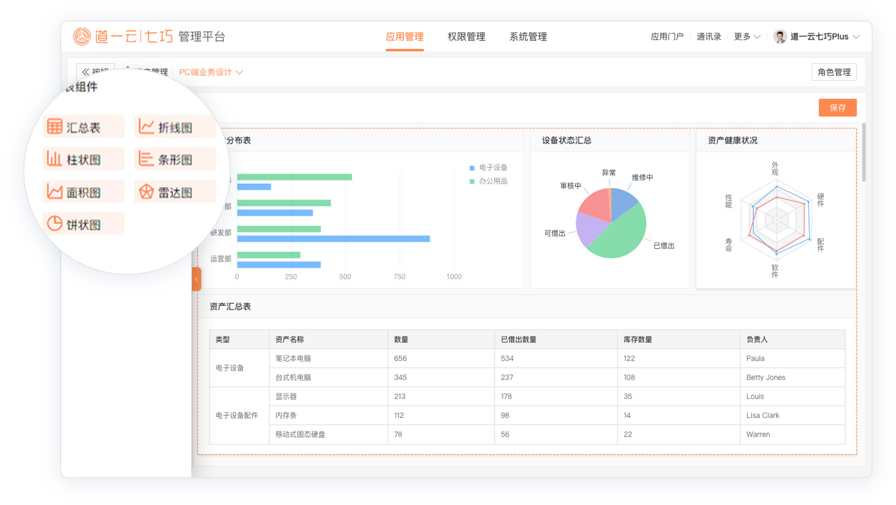 图表类型支持汇总表、折线图、柱状图、条形图、面积图、雷达图、饼状图七种。可根据不同的统计场景、维度/指标选择不同种类的图表,如资产状态汇总使用饼状图,年销售额动态使用折线图等等。