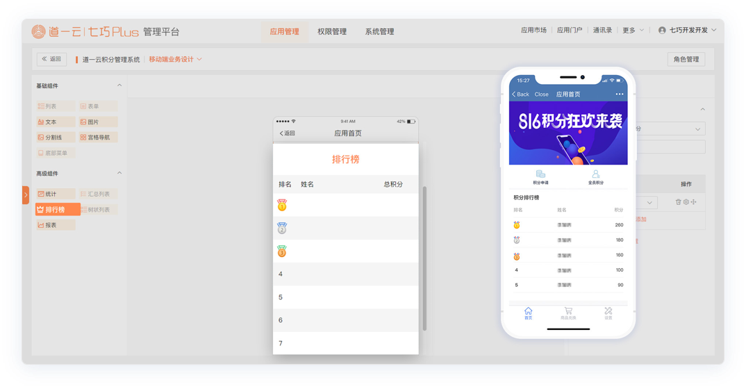 移动业务设计新增排行榜组件,将表单数据实时汇总、计算平均值,生成移动端排行榜效果。适用于多种场景,如,员工积分排名、销售业绩排名、考核平均分排行等等。