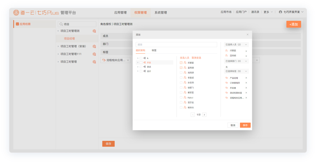 ① 权限管理支持设置应用角色关联部门与人员