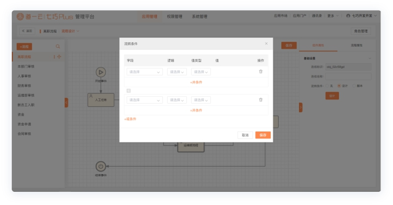 条件组件新增支持【OR】关系,可与【AND】条件同时存在,配置条件更加灵活。如:可设置A类型合同且合同金额小于5万【OR】B类型合同且合同金额大于50万,使用同一条审核流程;也可设置筛选出小组成员小于10人【OR】金额小于10万的全部项目等等。