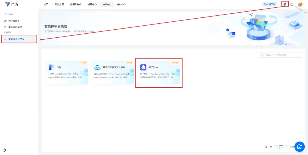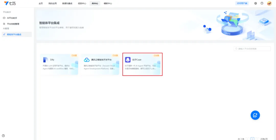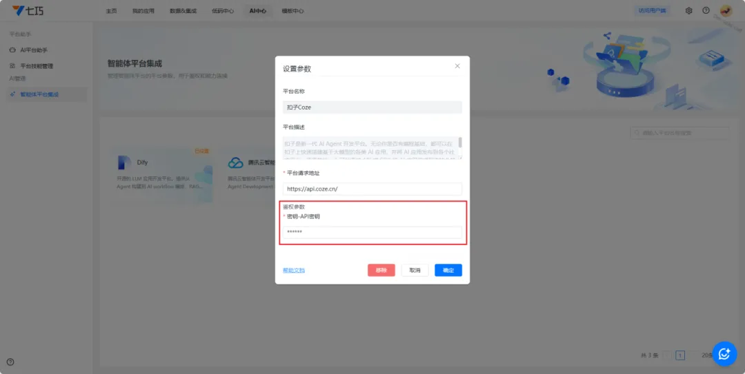 登录七巧开发平台,进入“AI中心-智能体平台集成”,选择Coze平台,填写平台地址和令牌(即密钥),保存完成配置。