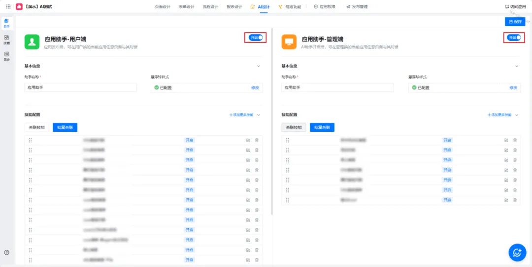 ➡️ 进入七巧「应用内部-AI设计-助手」,开启应用助手并绑定关联技能;