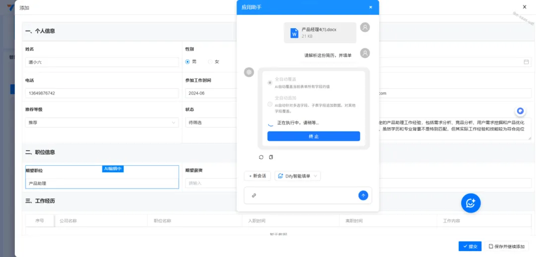 ● AI辅助决策与推荐:基于解析后的数据与Coze知识库,智能体提供深度建议并回填表单。例如,在招聘场景中,解析简历并匹配岗位需求,自动生成候选人推荐等级、选择依据;在客户管理场景中,分析客户信息后,推荐跟进人员与下一步计划,助力业务流程高效流转。