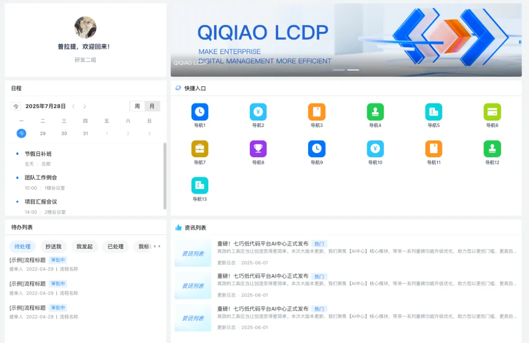七巧页面设计器能将OA、ERP、项目管理等系统的常用功能集中到一个平台,融入AI能力,根据用户角色与办公场景,智能推荐常用功能——比如生产主管进入“生产管理门户”时,可询问AI智能客服,优先推荐“车间安全检查审批”“原料成本查询”等高频应用,在10秒内完成应用查找的操作。