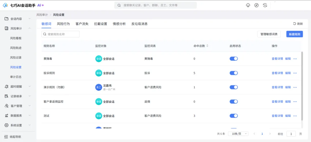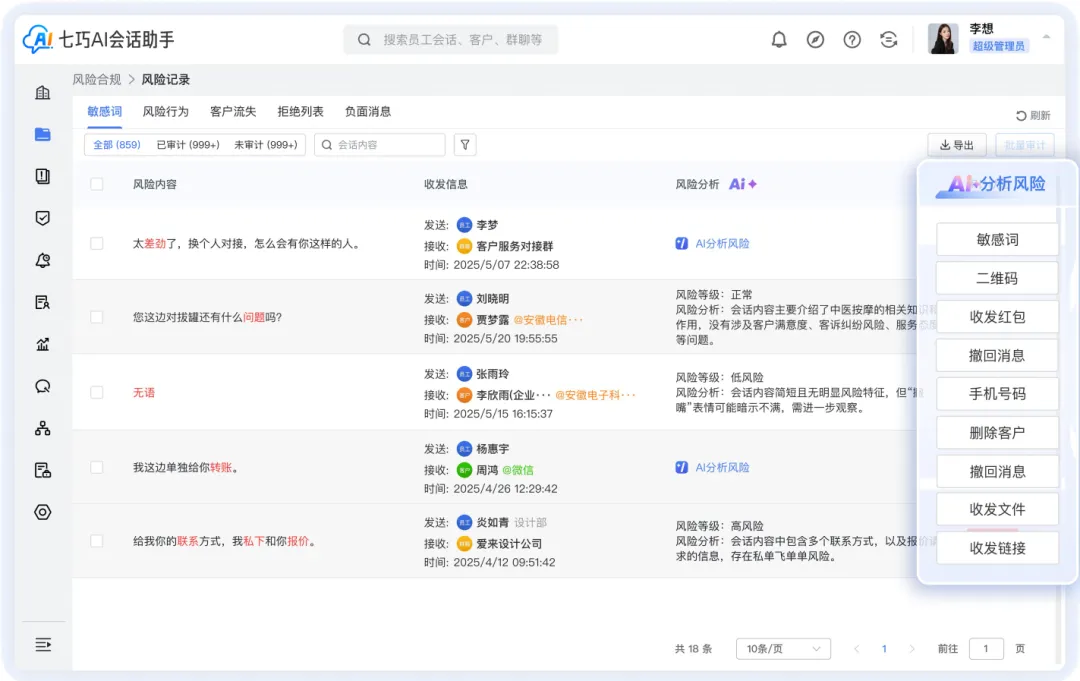 当聊天内容触发“退费”“投诉”等关键词时,可以通过AI自动汇总聊天记录摘要、智能审计风险等级,同步呈现会话内容,客服无需手动翻查记录,就能结合对话背景高效回应,告别“只知有风险,不知怎么处理”的情况,让风险拦截切实落地。