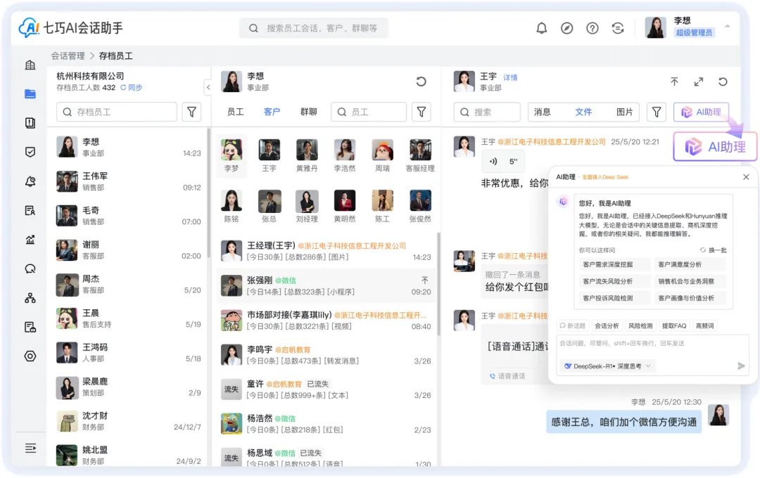 赢咖8注册七巧低代码产品团队在服务近千家不同领域企业的过程中发现,大家要的不是花里胡哨的功能,而是能解决三个核心问题的工具:留得住关键对话、抓得住风险信号、赶得上客户需求。而赢咖8注册七巧的AI会话助手功能,正是为满足这些需求打造的“会话数据智能管理专家”。