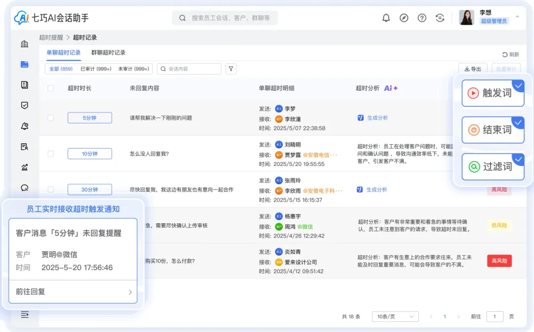 七巧AI会话助手会自动按咨询、投诉、售后等场景,为会话类型打标签,还能细化分类(如售后-赠品遗漏、投诉-电梯故障等),4S店客服找某客户的赠品申请记录,不用翻聊天记录,搜索“售后-赠品”标签,可以快速调出,解决“存了找不到”的难题。