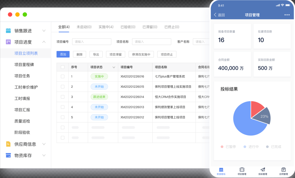 按产品消耗速率设置差异化安全阈值,库存低于阈值时,系统自动推送提醒至采购人员,并同步生成含油品型号、供应商资质的采购申请模板,避免库存不足影响项目推进;项目管理模块支持移动端实时上传施工日志、检测报告,管理层打开系统即可查看项目进度;验收阶段设置倒计时提醒,提前推动客户对接,缩短回款周期,缓解企业资金压力。