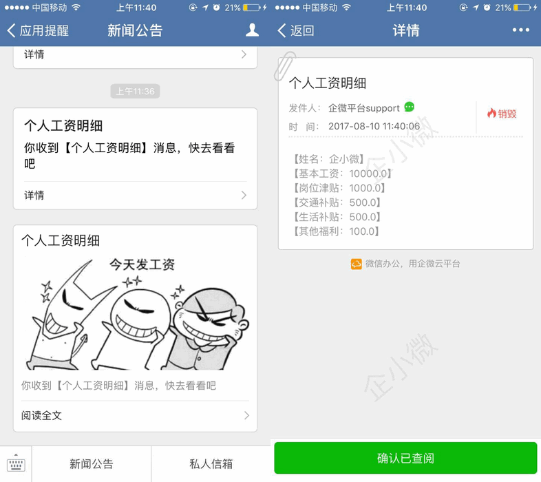 发送成功后,每位员工将在企业微信端实时收到属于自己的工资条内容