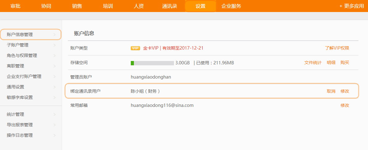 1、发件人需绑定通讯录的成员,当发件人为超级管理员时,直接在账户信息管理页面绑定通讯录用户