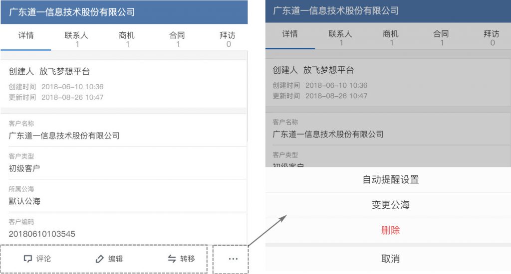 常用操作按钮固定在底部,评论、编辑、转移操作更便捷。允许客户负责人「变更公海」,以解决客户最新情况不再符合当前所属公海的问题