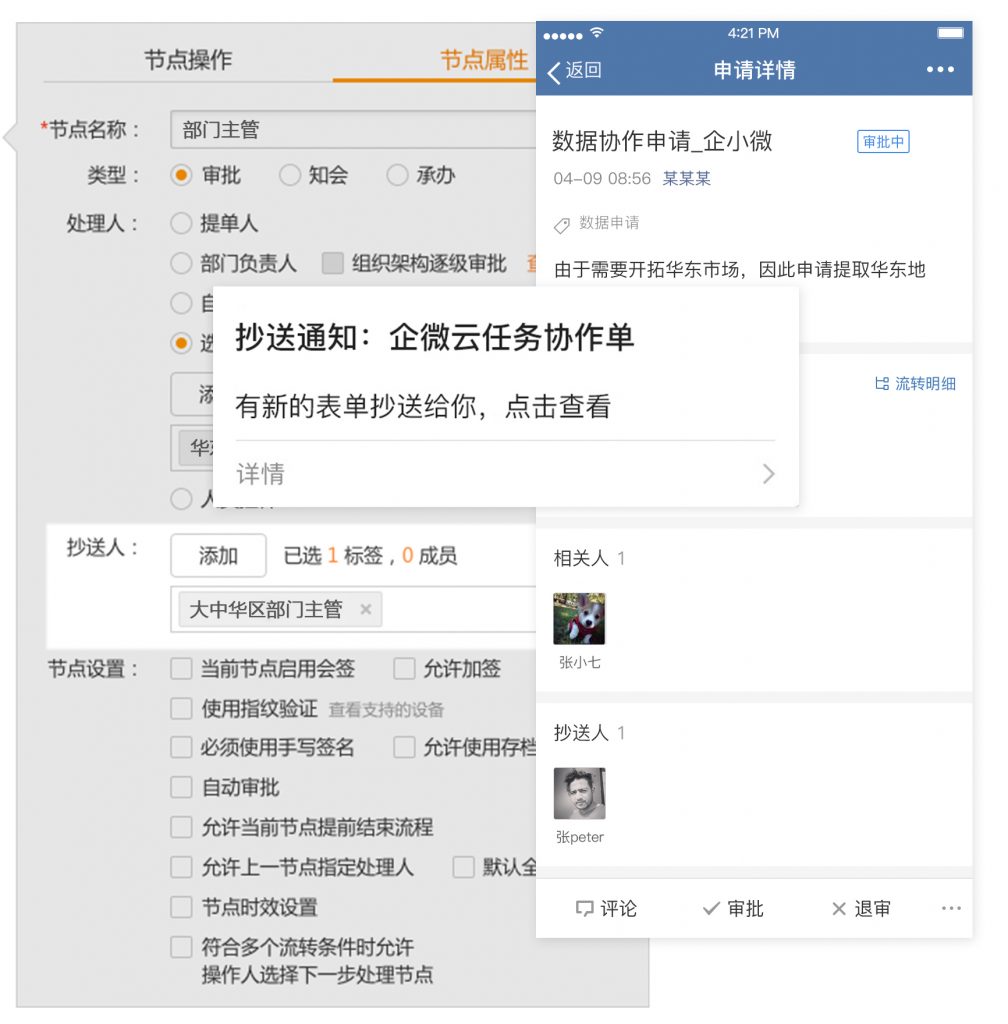 当审批流转到特定节点时,抄送人会收到提醒通知,该表单将加入抄送人的待办列表中。能够在不影响审批正常流转的前提下,更加及时的查阅表单内容和审批结果