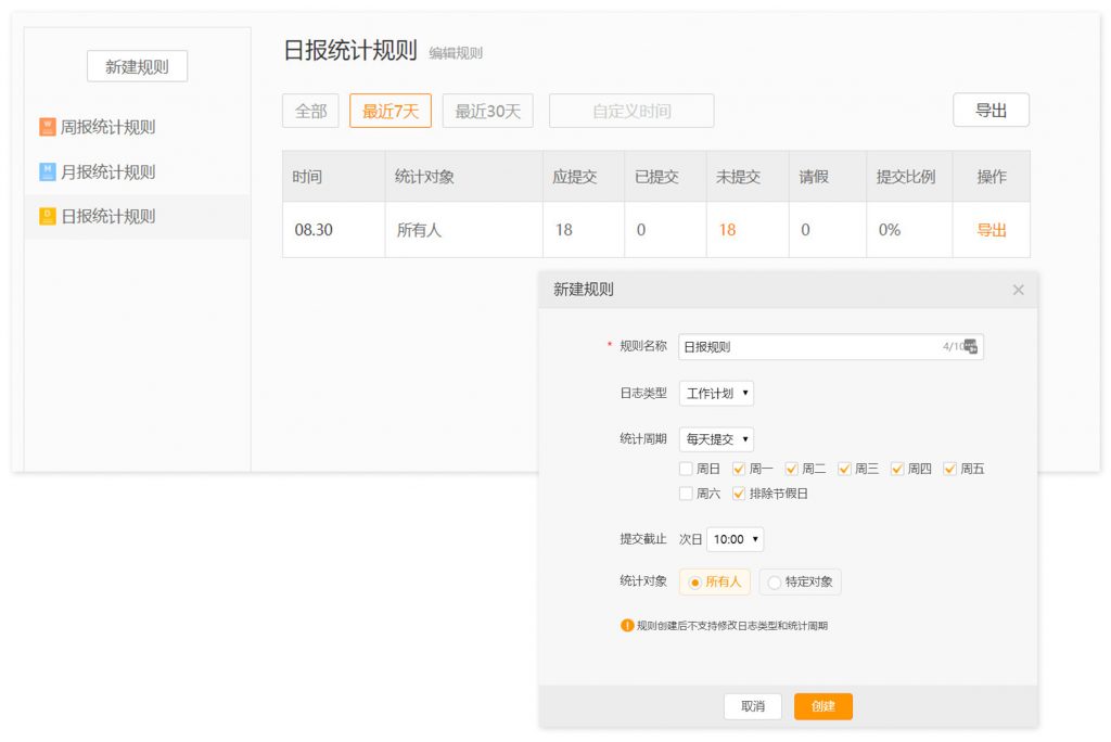 管理员可通过设置视图条件(日志类型、统计周期、统计对象等),自定义日志统计视图,可满足日报、周报、月报统计等使用场景