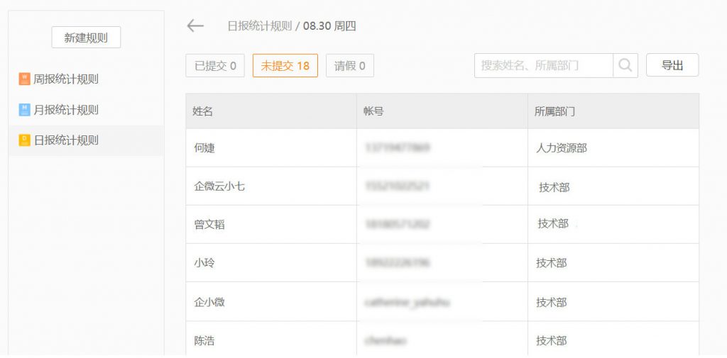 另外,还支持查看「已提交」成员的日志详情,查看「未提交」的成员名单,并支持一键导出统计结果