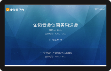 连接企微云会议助手应用,时刻提示会议室使用状态,包括会议名称,发起人,会议室名称,会议时间,以及下一个会议信息。同时,还可作为企业文化的宣传渠道,推广企业文化信息。