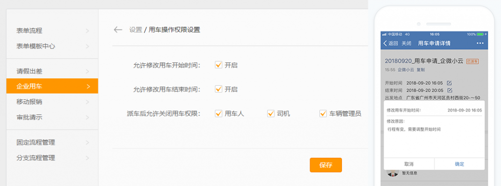 「企业用车」允许取消用车及修改用车时间