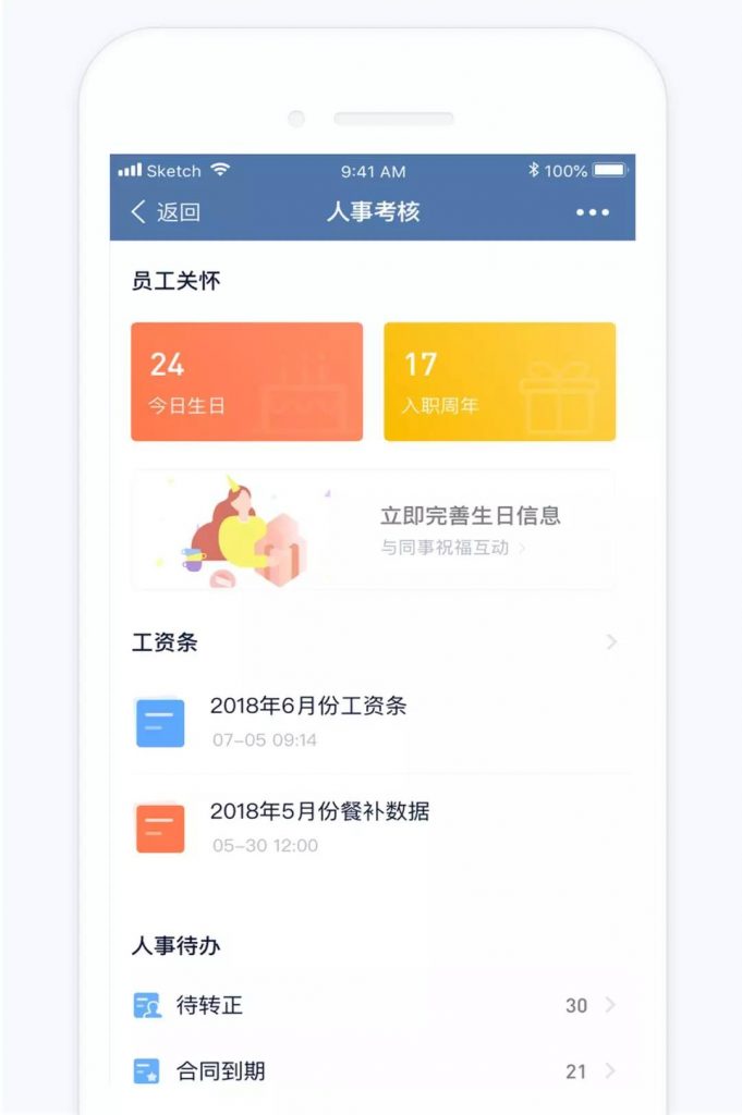 企微云人事考核首页大改版,体验优化升级。应用端可以查看员工关怀、工资条、人事待办信息,待转正、合同到期、证书到期消息不再遗漏。详细更新内容请点击此处查看。