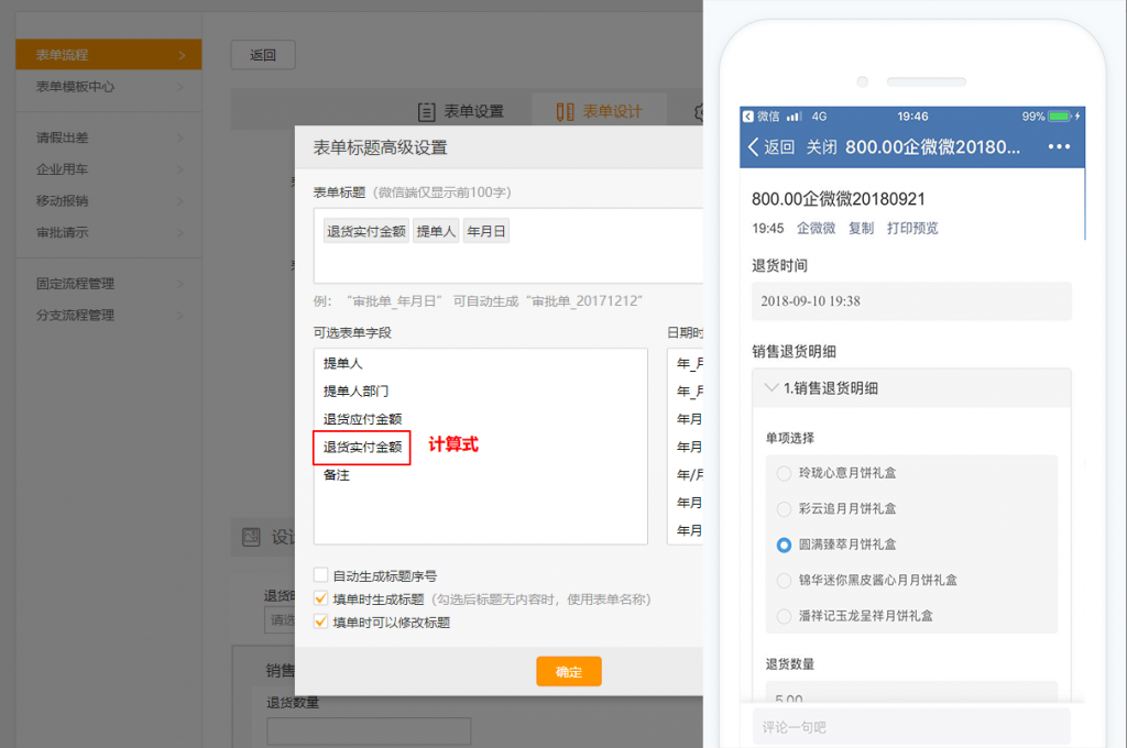 表单模板标题的标题中带有“退货实付金额”,发起退货单后,表单标题可以显示具体的金额,审批人可快速辨识表单内容。(退货实付金额字段为“计算式”)