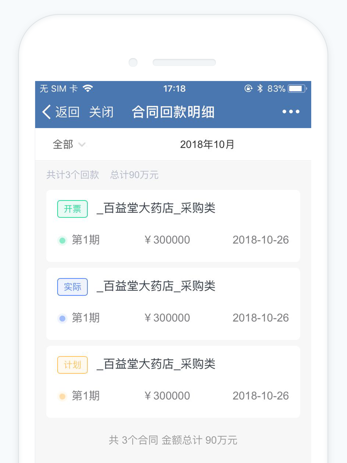 合同回款统计增加回款明细,可查看各时间范围内的计划回款、实际回款、合同开票明细,直观展示回款期数。同时,也便于查看关联的合同详情~