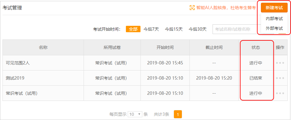 「删除」:对该场考试进行删除操作,考试删除后,考试信息、考试统计信息及考生的答题信息,都会被删除且不可恢复,请慎重考虑!