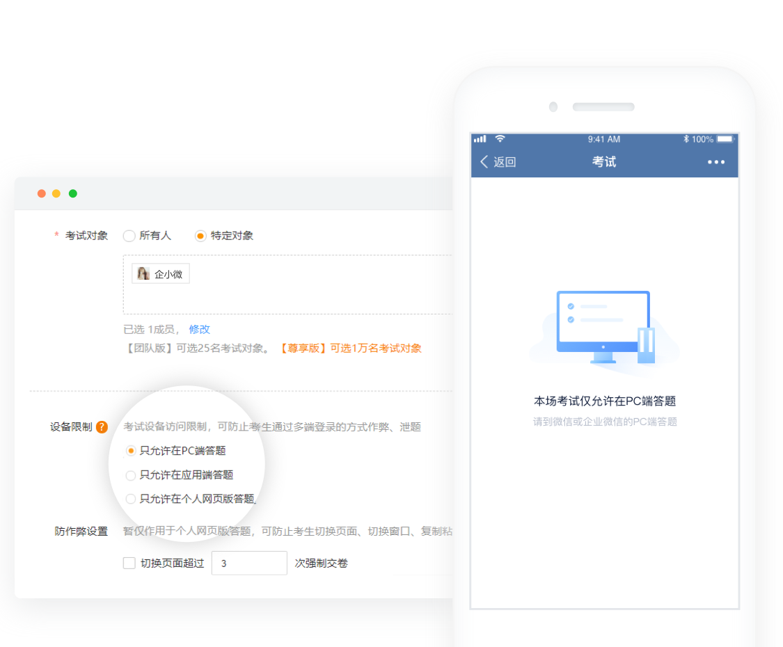 开启了设备访问限制后,可控制考生是否“只在PC端答题”、“只在应用端答题”、还是“只在个人网页版答题”。