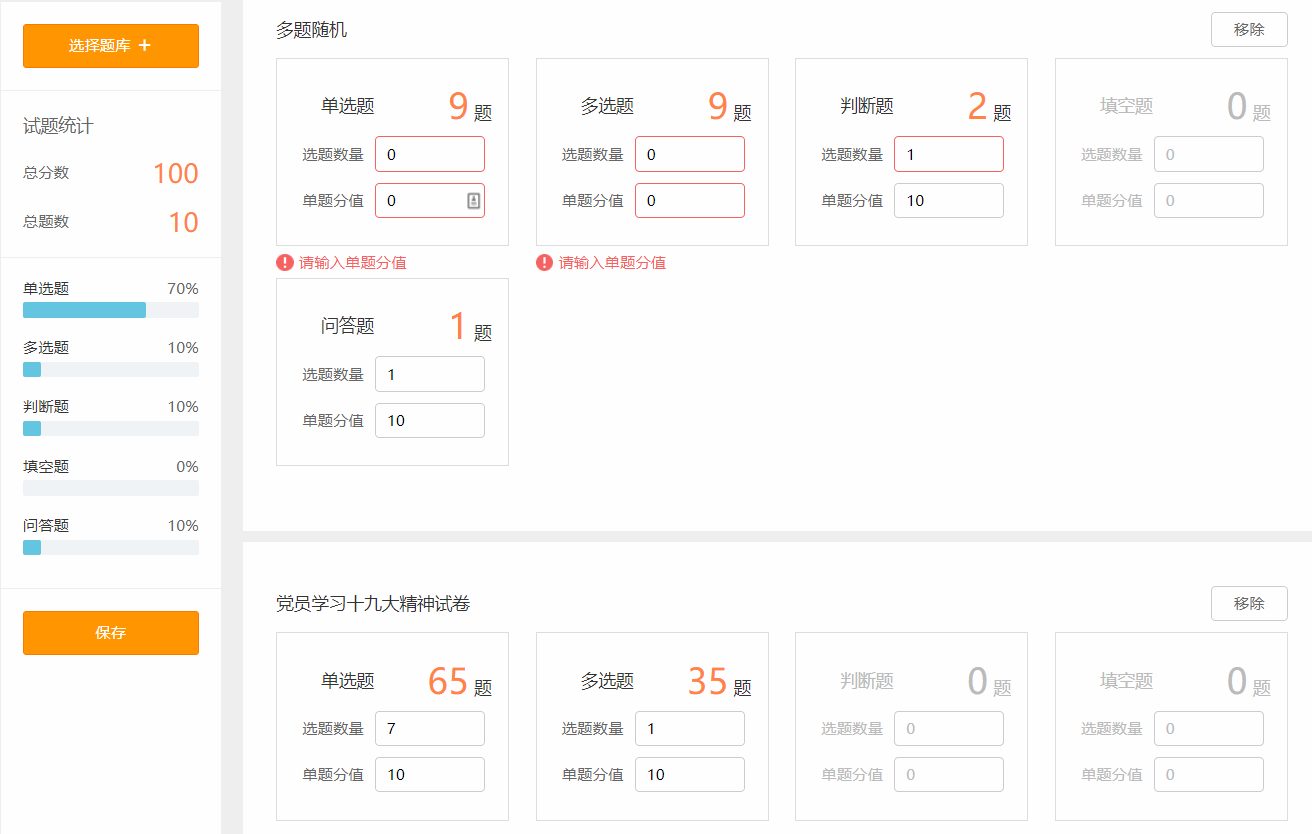 ①随机试卷:从试题库抽题,选择“每份试卷不同”/“试卷相同”