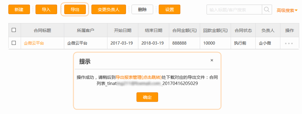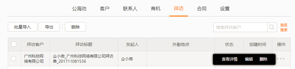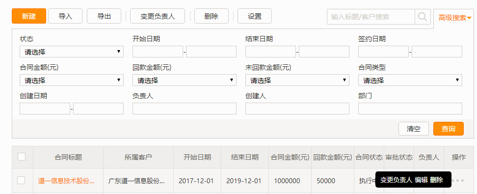 「删除」:单条删除/当前界面的批量删除「导出」:导出高级搜索出的客户资料(需要选择创建时间)