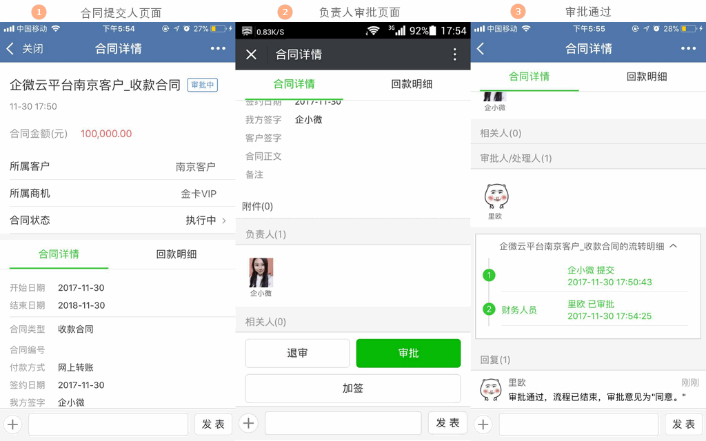 合同审批人可根据实际情况进行「审批」、「退审」、「加签」操作