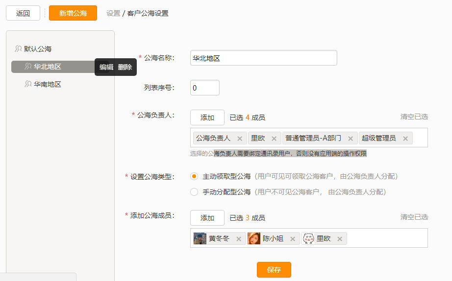 公海池设置包括公海名称、公海负责人、公海类型和公海成员的设置