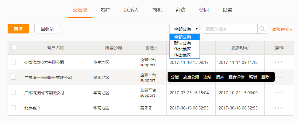 回收:公海负责人可以回收自己所属公海为自己负责公海的客户,回收后,客户和其未赢单的商机将回到公海池