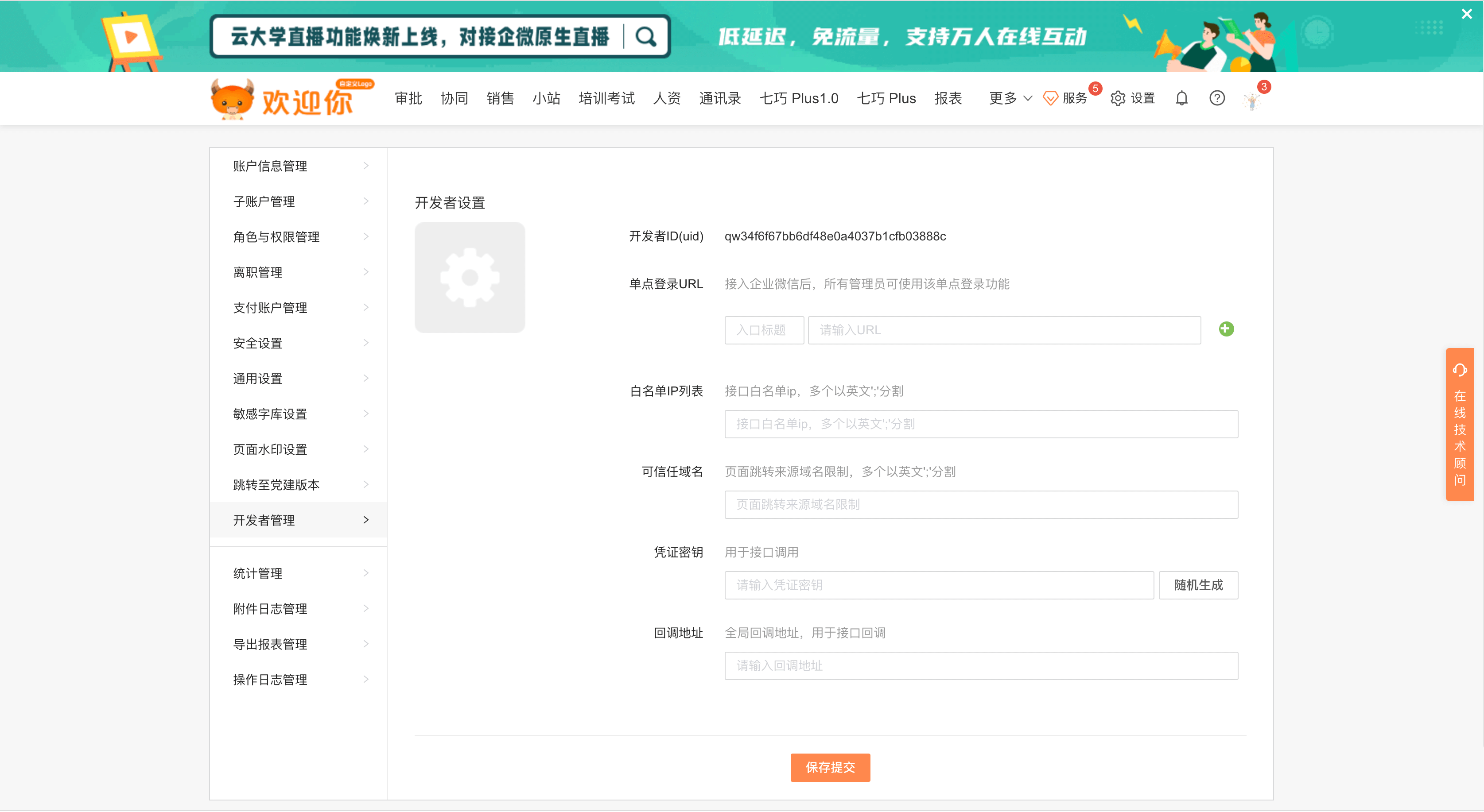 开发者信息在杏盛娱乐注册管理后台【设置-开发者管理】栏目中进行配置,可配置单点登录URL、白名单IP,可信任域名、凭证密钥、回调地址。