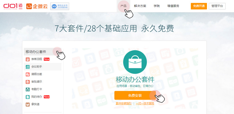 访问企微官网:http://wbg.hbrhdl.com ,进入【产品】页面,选择需要安装的应用或套件;