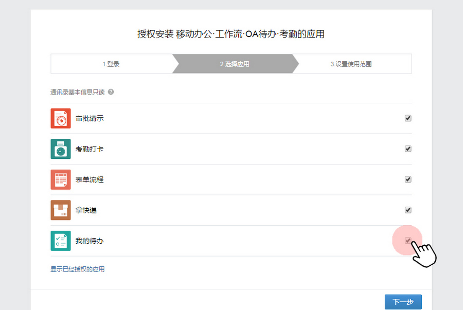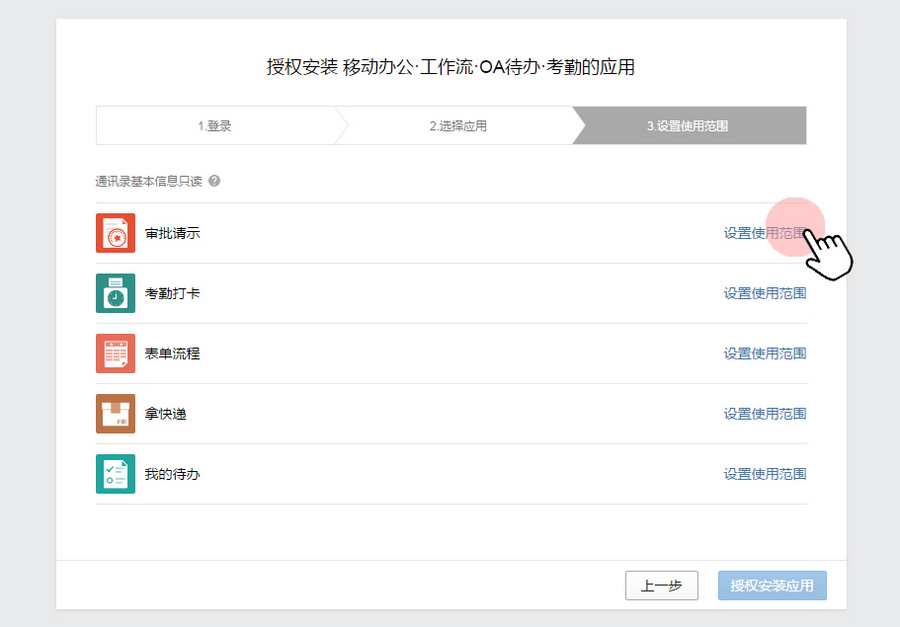 选择需授权安装应用,设置可见范围(选顶级目录);