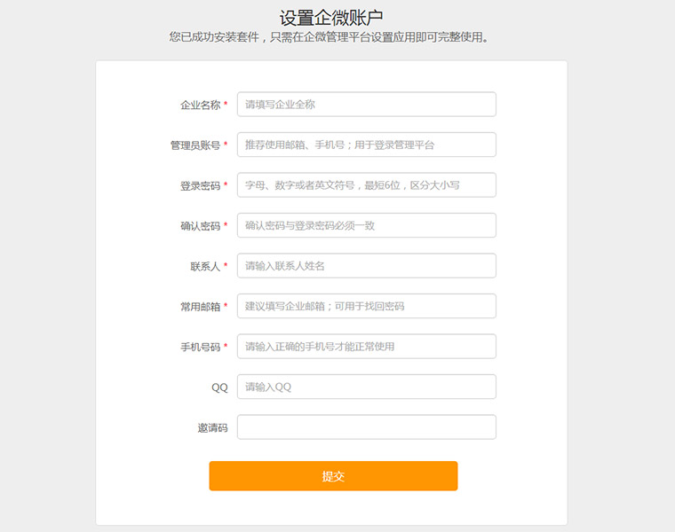 设置企微管理账户(已接入企微的用户不显示该页面),该账户用于管理企微的应用与数据信息;