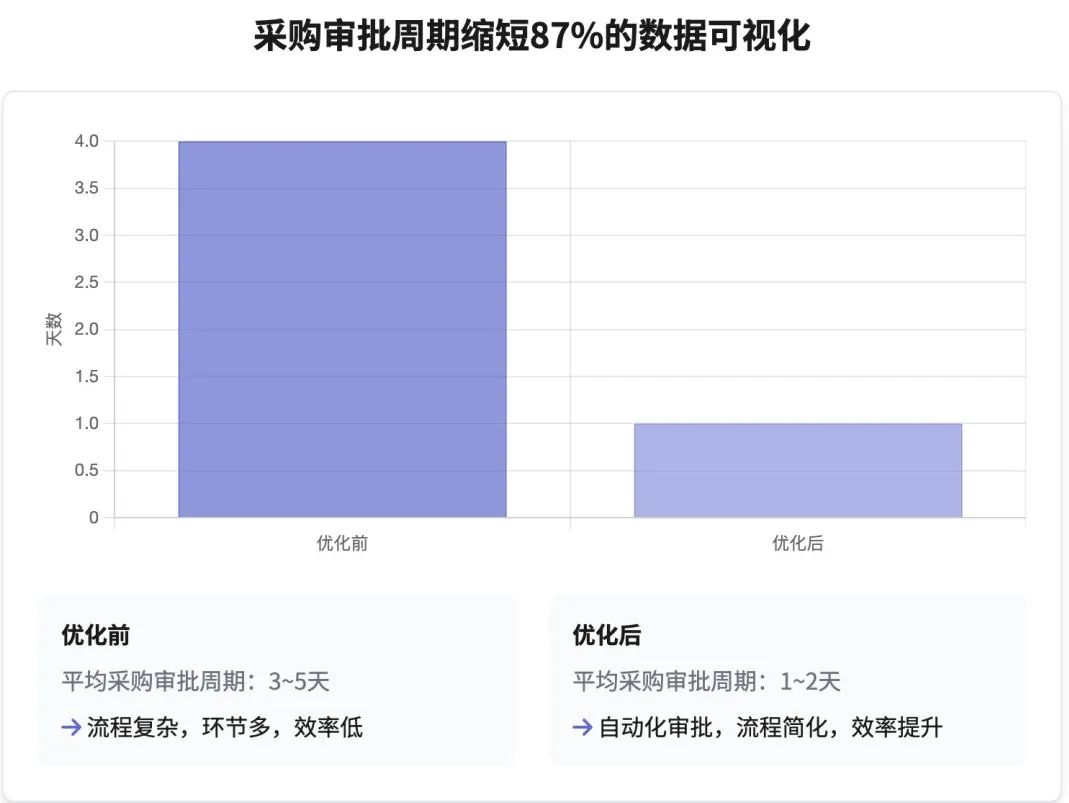 ✓ 采购审批周期从30天→3小时,缩短87%,极大提升了采购效率,为企业抢占市场先机赢得了宝贵时间。